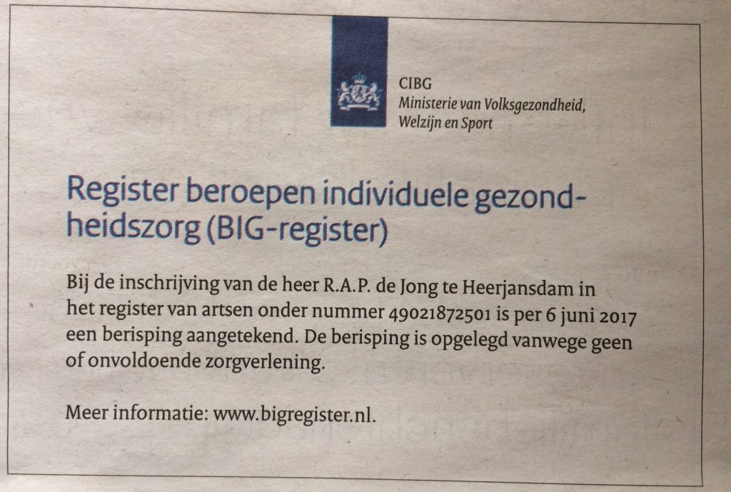 De berisping is per 6 juni 2017 aangetekend in zijn inschrijving in het BIG-register. Het is niet bekend waarom de huisarts een berisping heeft gekregen. Wel is bekend dat de berisping is opgelegd door het tuchtcollege voor de gezondheidszorg of het College van Medisch Toezicht.