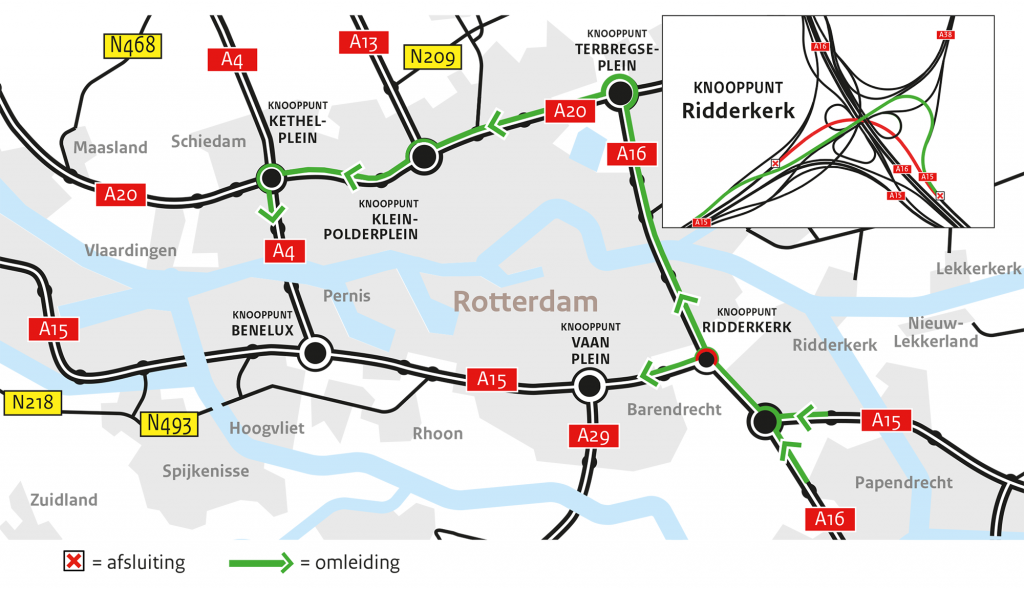 De werkzaamheden gaan vrijdagavond om 22.00 uur van start. Tijdens de weekendafsluiting is de A15 in de richting van Europoort bij knooppunt Ridderkerk afgesloten. Weggebruikers moeten rekening houden met een extra reistijd van 10 tot 30 minuten. Bij ongunstige weersomstandigheden kunnen de werkzaamheden worden uitgesteld naar het weekend van 22, 23 en 24 november.